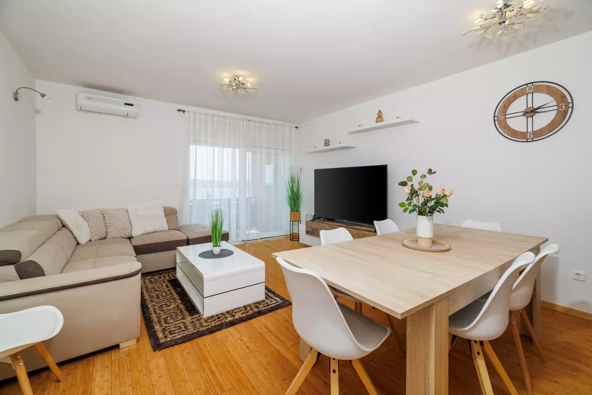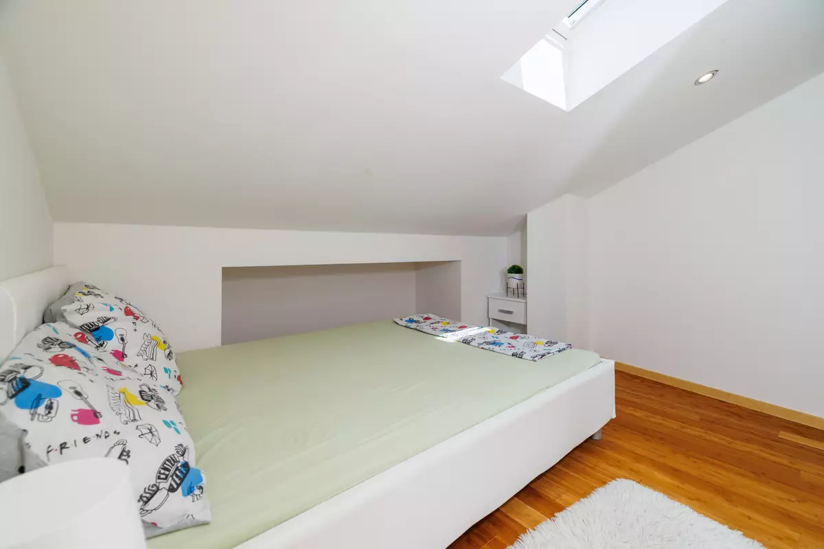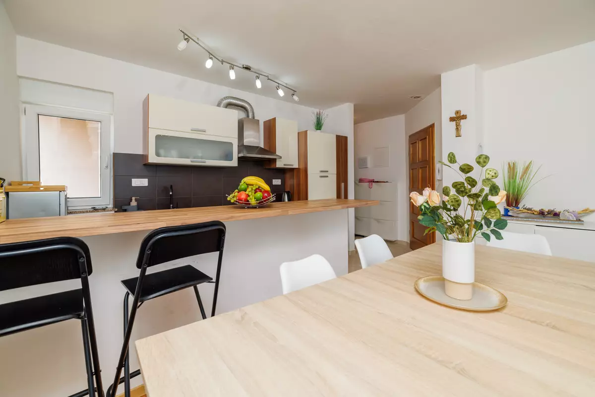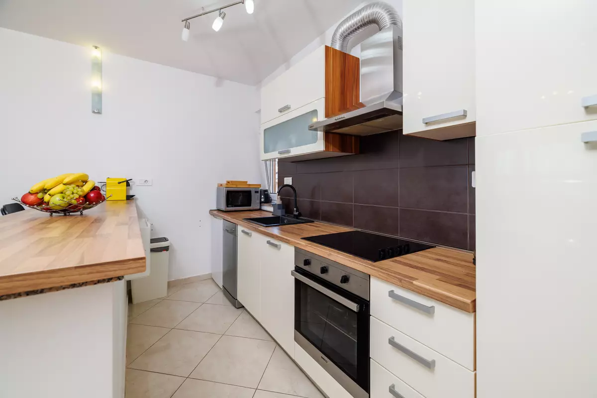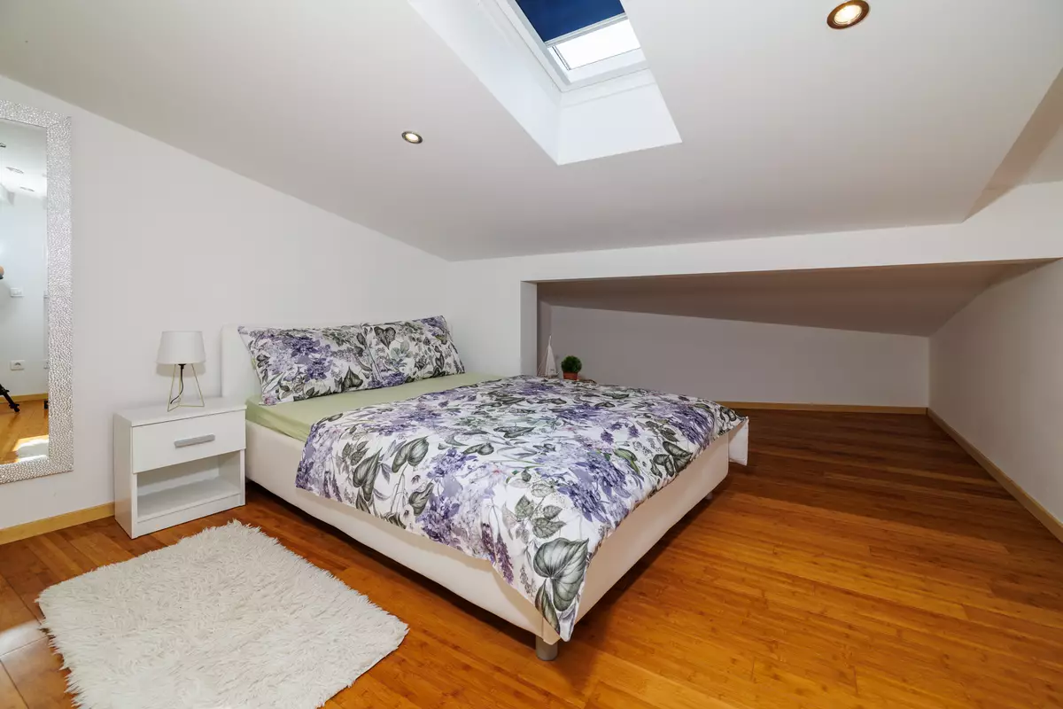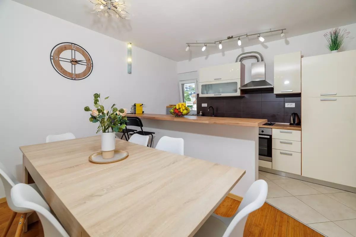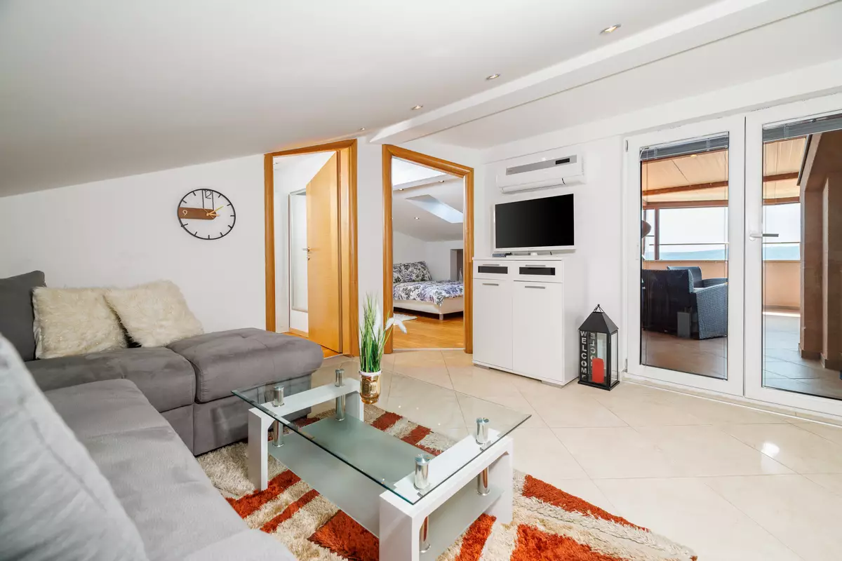 Die Ferienwohnung verläuft auf 2 Etagen, der Eingang zur Wohnung befindet sich im 2. Obergeschoss. Ausgestattet mit einem grossen Wohn - und Essbereich mit Küche , einem zusätzlichem Wohnbereich, 4 Schlafzimmer, 2 Badezimmer und 2 möblierte Balkone mit einem traumhaften Meerblick.