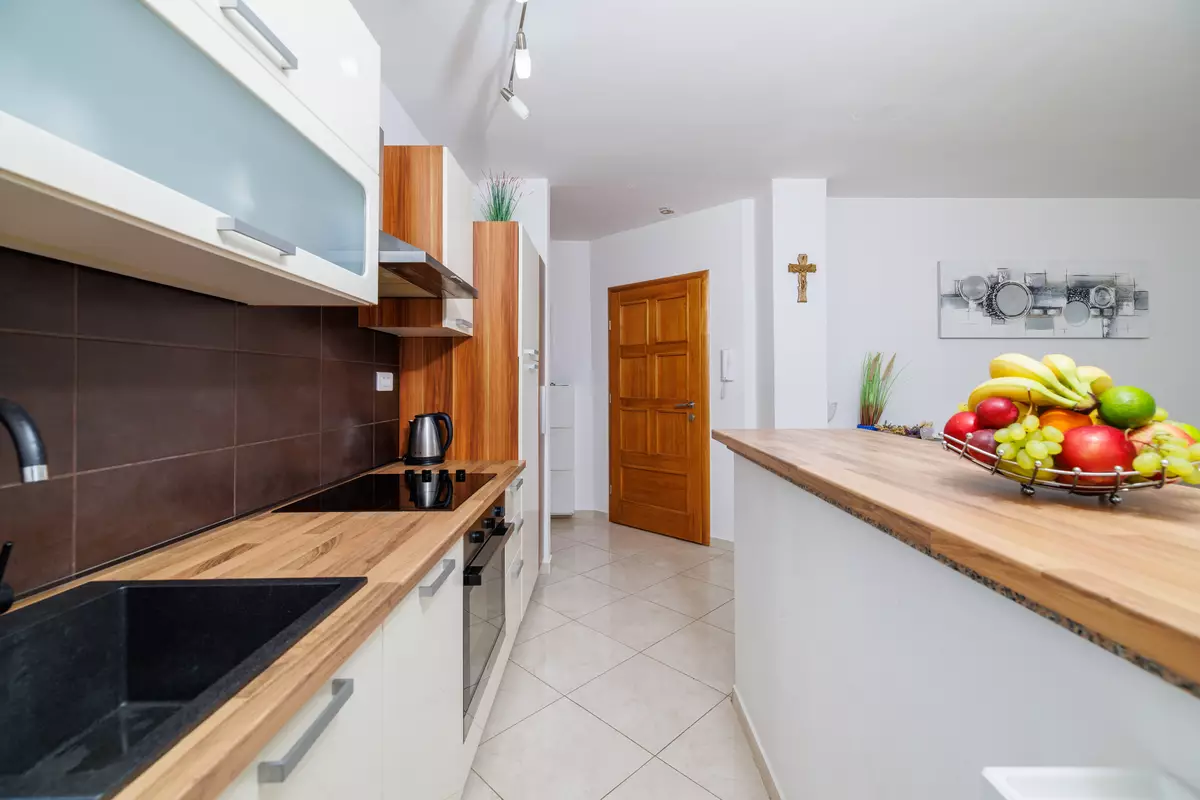 Geschirr, Küchenhandtücher, Elektroherd, Kochplatten: 4, Backröhre, Kühlschrank mit Gefrierfach, Wasserkocher, Mikrowelle, Toaster, Geschirrspülmaschine