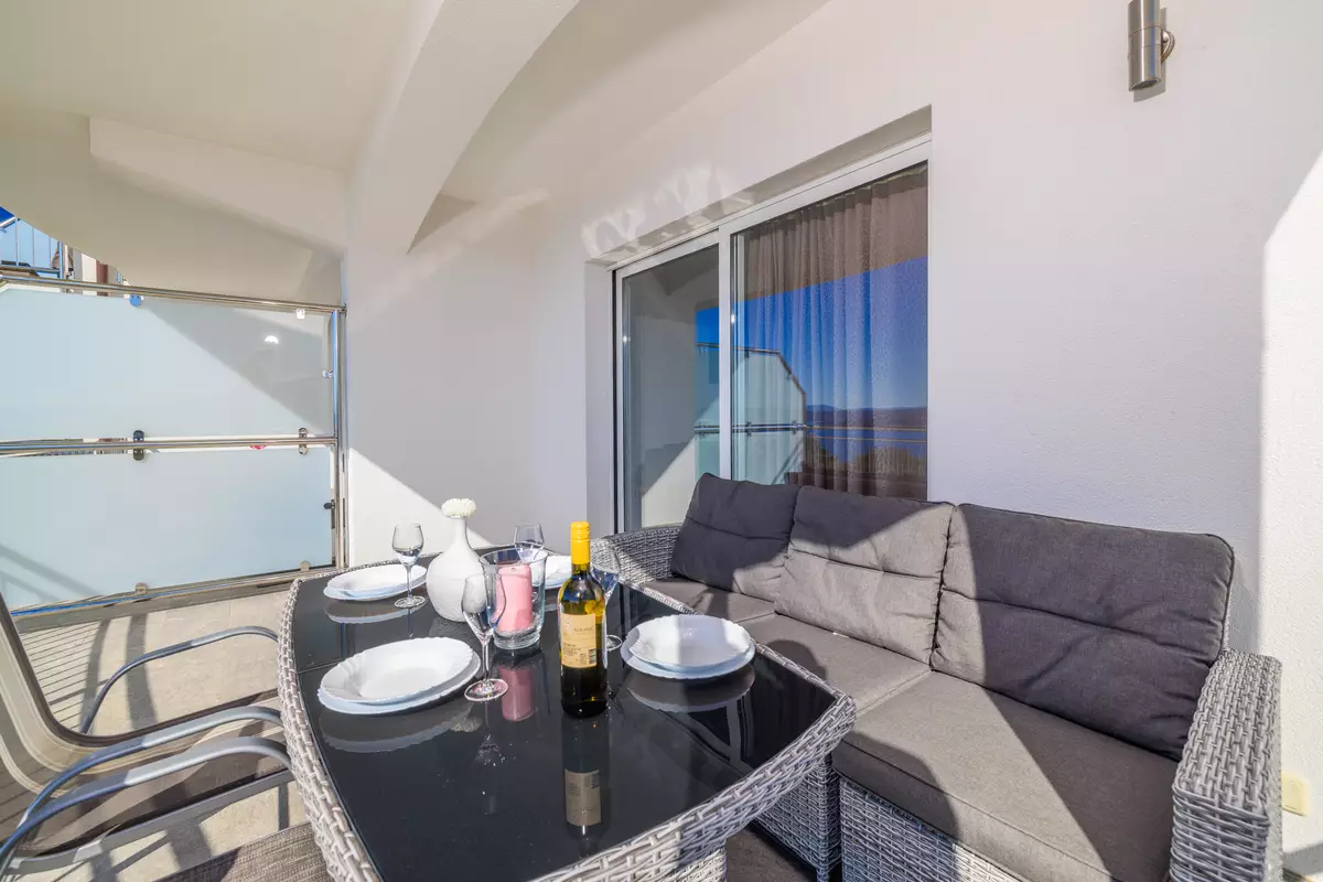 own covered balcony with sea view, seating, balcony size: 16 m²