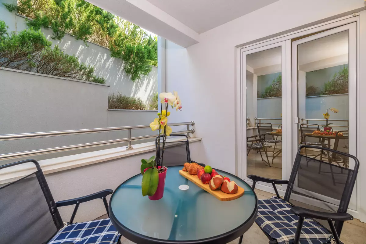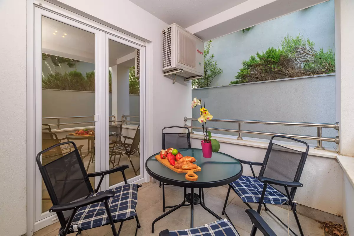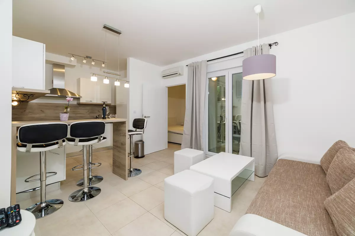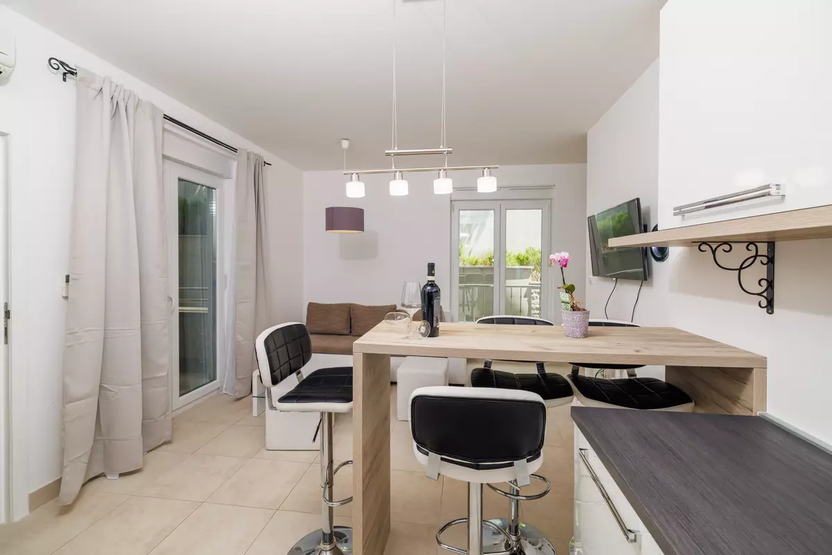 Ima otvoreni dnevni boravak i blagovaonicu s potpuno opremljenom kuhinjom koja vas poziva na zajedničko kuhanje i opuštanje. Odvojena spavaća soba osigurava mirne noći, dok je moderna kupaonica opremljena svim potrebnim sadržajima. Natkriveni i namješteni balkon nudi ugodno mjesto za uživanje u svježem morskom zraku.