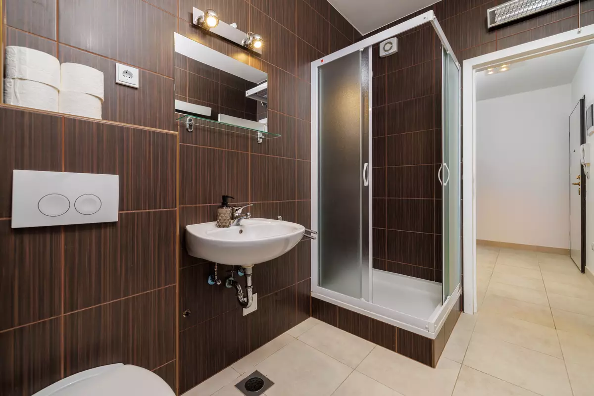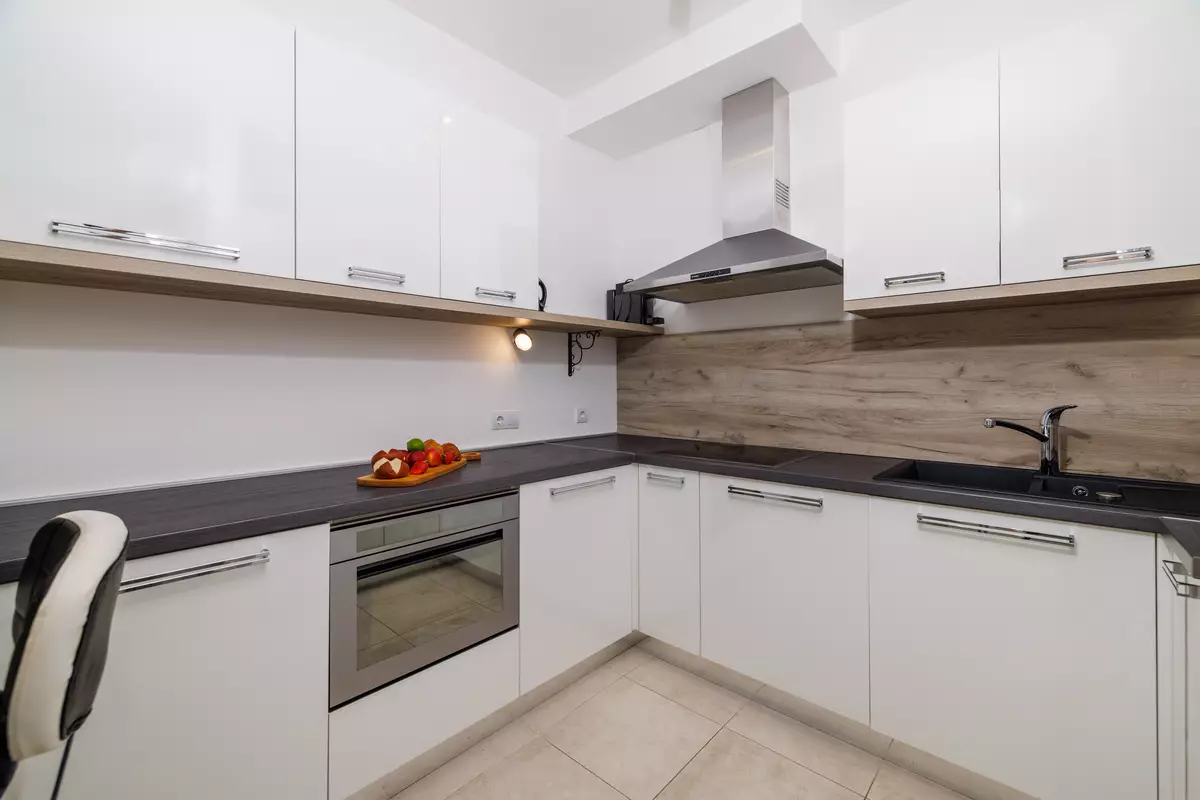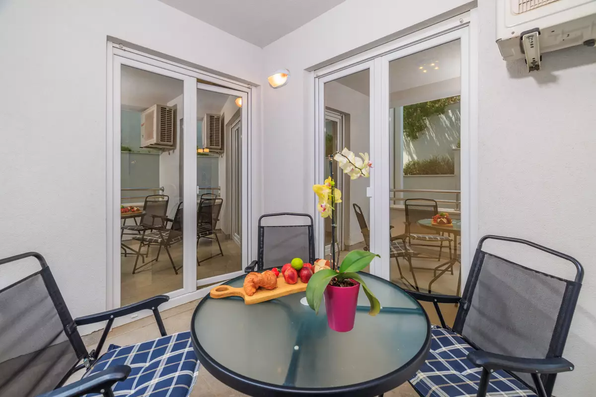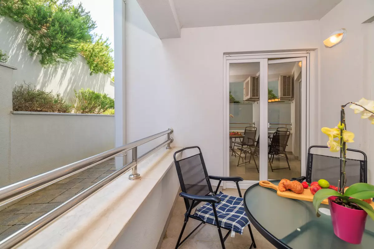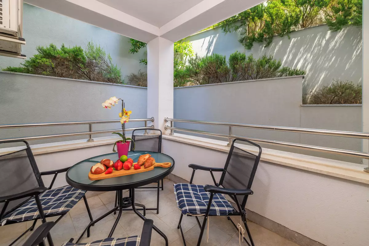 Ima otvoreni dnevni boravak i blagovaonicu s potpuno opremljenom kuhinjom koja vas poziva na zajedničko kuhanje i opuštanje. Odvojena spavaća soba osigurava mirne noći, dok je moderna kupaonica opremljena svim potrebnim sadržajima. Natkriveni i namješteni balkon nudi ugodno mjesto za uživanje u svježem morskom zraku.