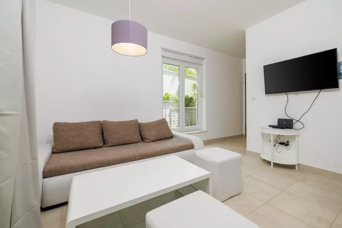 Dnevni boravak/blagovaona i kuhinja su jedna prostorija, kauč na razvlačenje za 2 osobe, izlaz na balkon/terasu, pločice, SAT TV