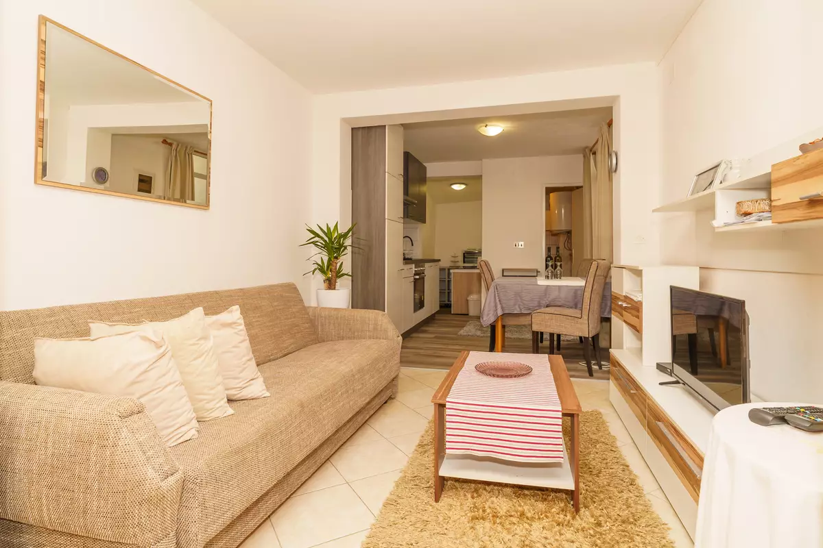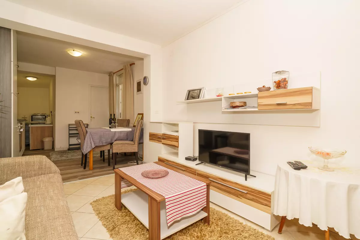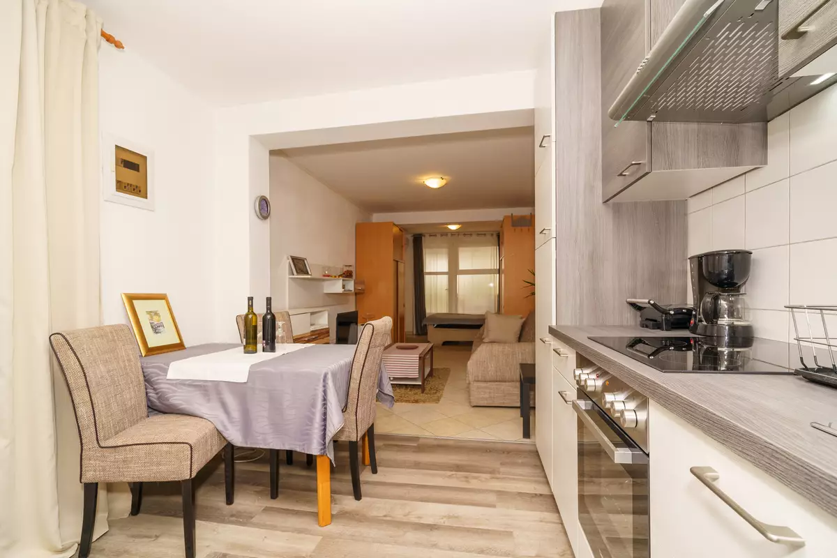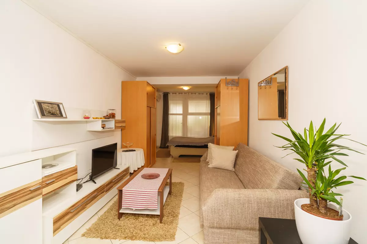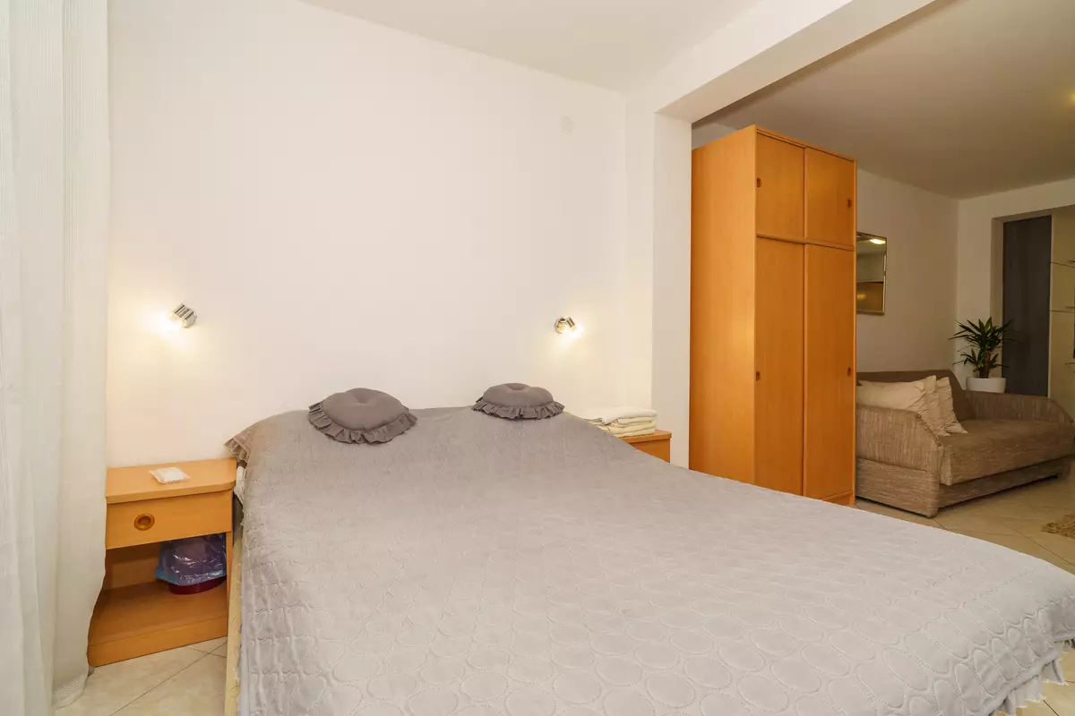 DETALJNI OPIS: Dnevni boravak: Dnevni/blagavaonica/kuhinja i spavaća soba su jedna prostorija, terasa, pločice, SAT TV Kuhinja: kuhinja, posuđe, kuhinjski krpe, kombinirani štednjak struja/plin, ploče za kuhanje:4, pećnica, hladnjak bez zamrzivača, filter aparat za kavu Kupaonica: Kupaonica s WC-om, tušem Balkon/terasa: Privatna terasa, natkrivena, namještaj za sjedenje, površina terase: 13 m² Više informacija: Parking uz kuću, k...