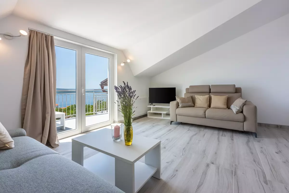 Iz dnevnog dijela imate izravan izlaz na balkon ovog stana s kojeg se pruža fantastičan pogled na more.