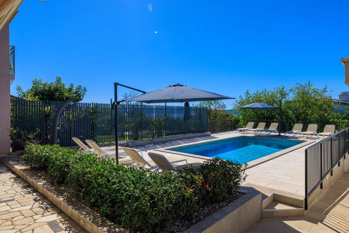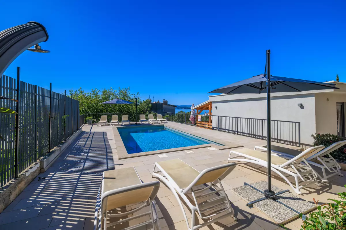 Izvan kuće nalazi se središnji dio posjeda – prekrasan bazen opremljen s 10 ležaljki i vanjskim tušem, idealan za sunčanje i uživanje tijekom toplih dana. Prostrana terasa i zona za roštilj dodatno obogaćuju vanjski prostor, pružajući savršeno mjesto za obiteljska druženja i opuštanje na otvorenom.