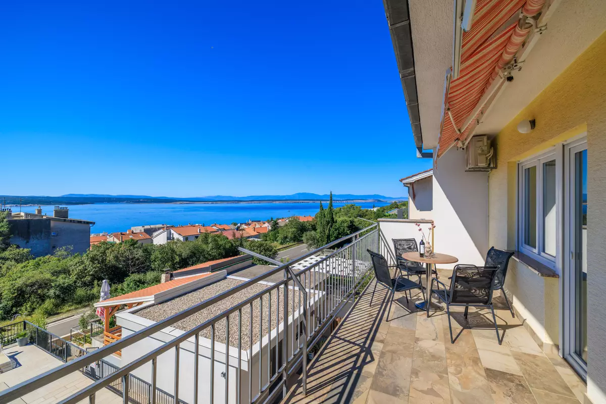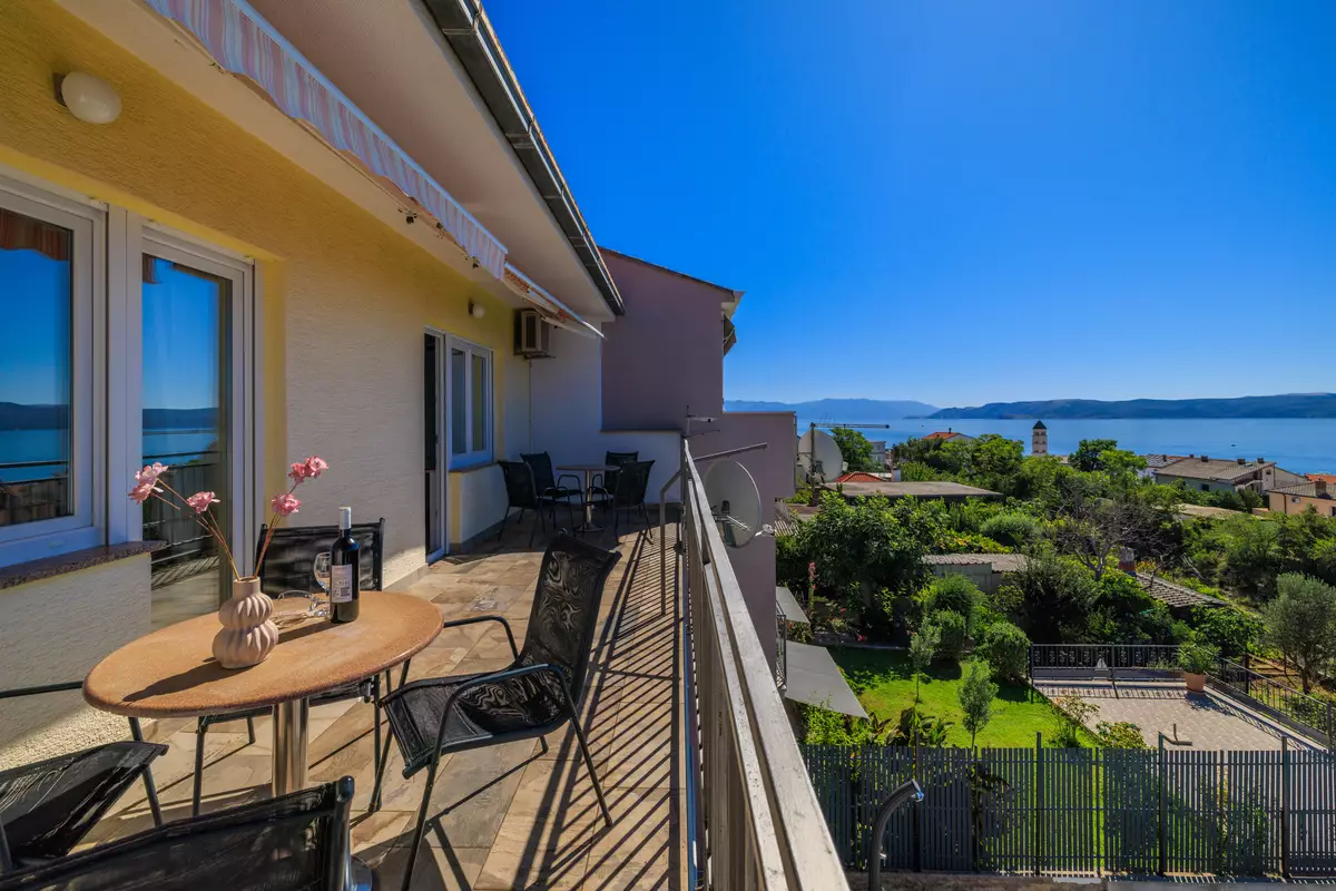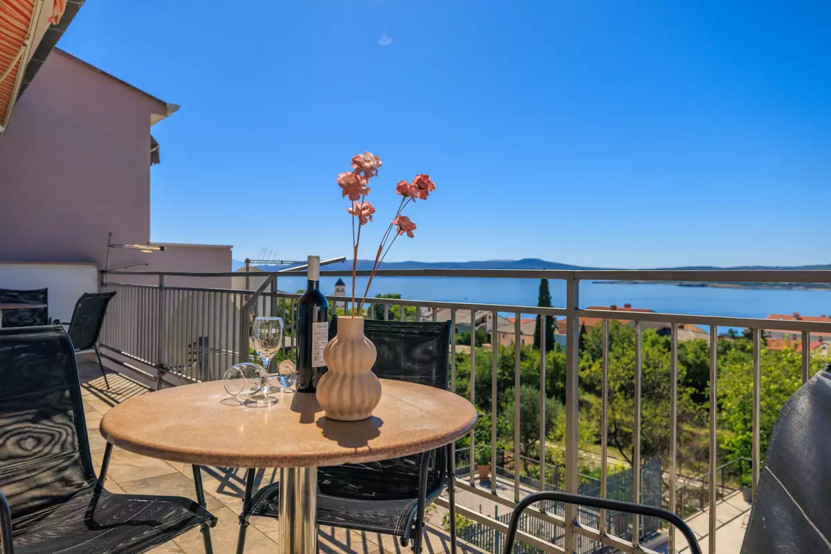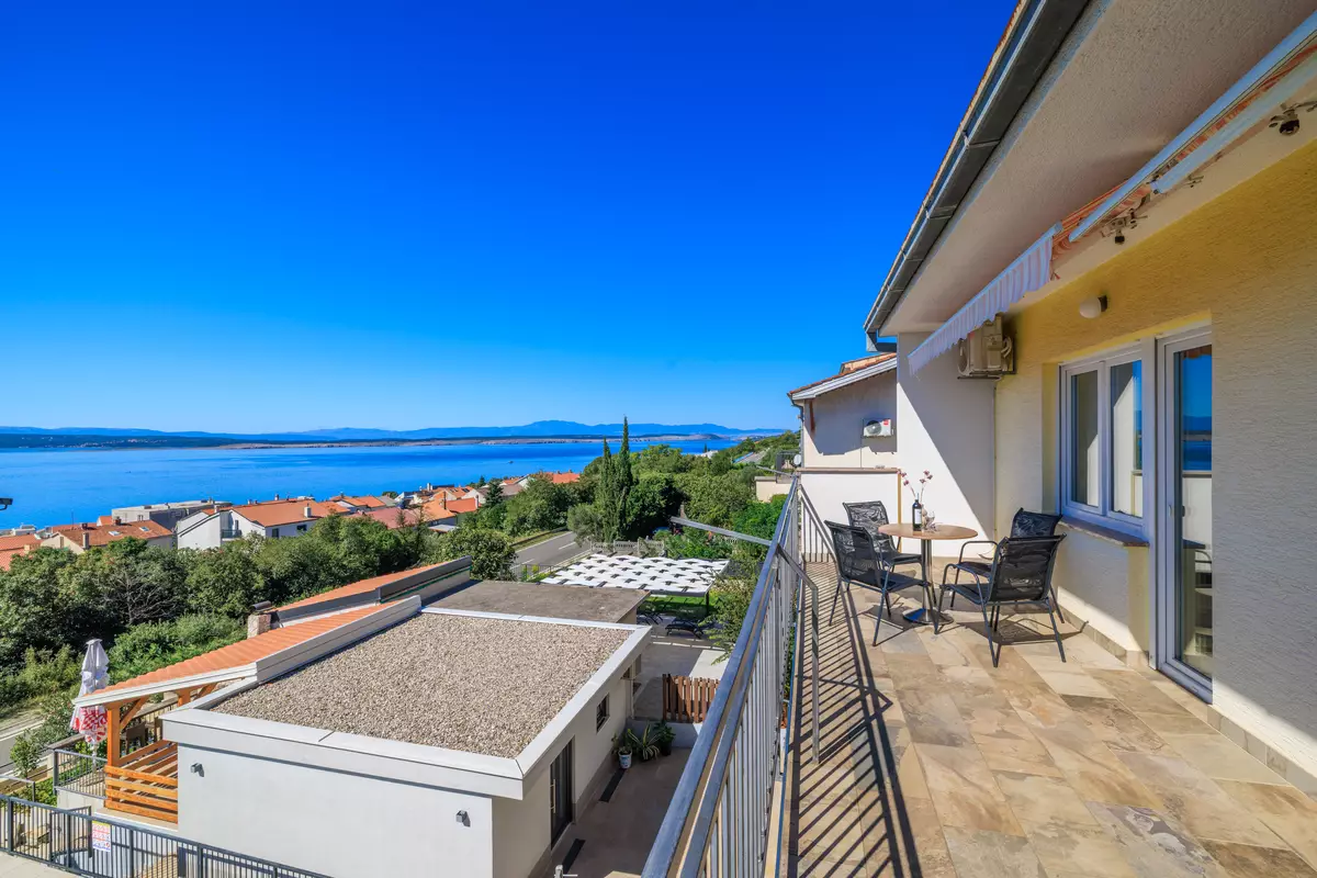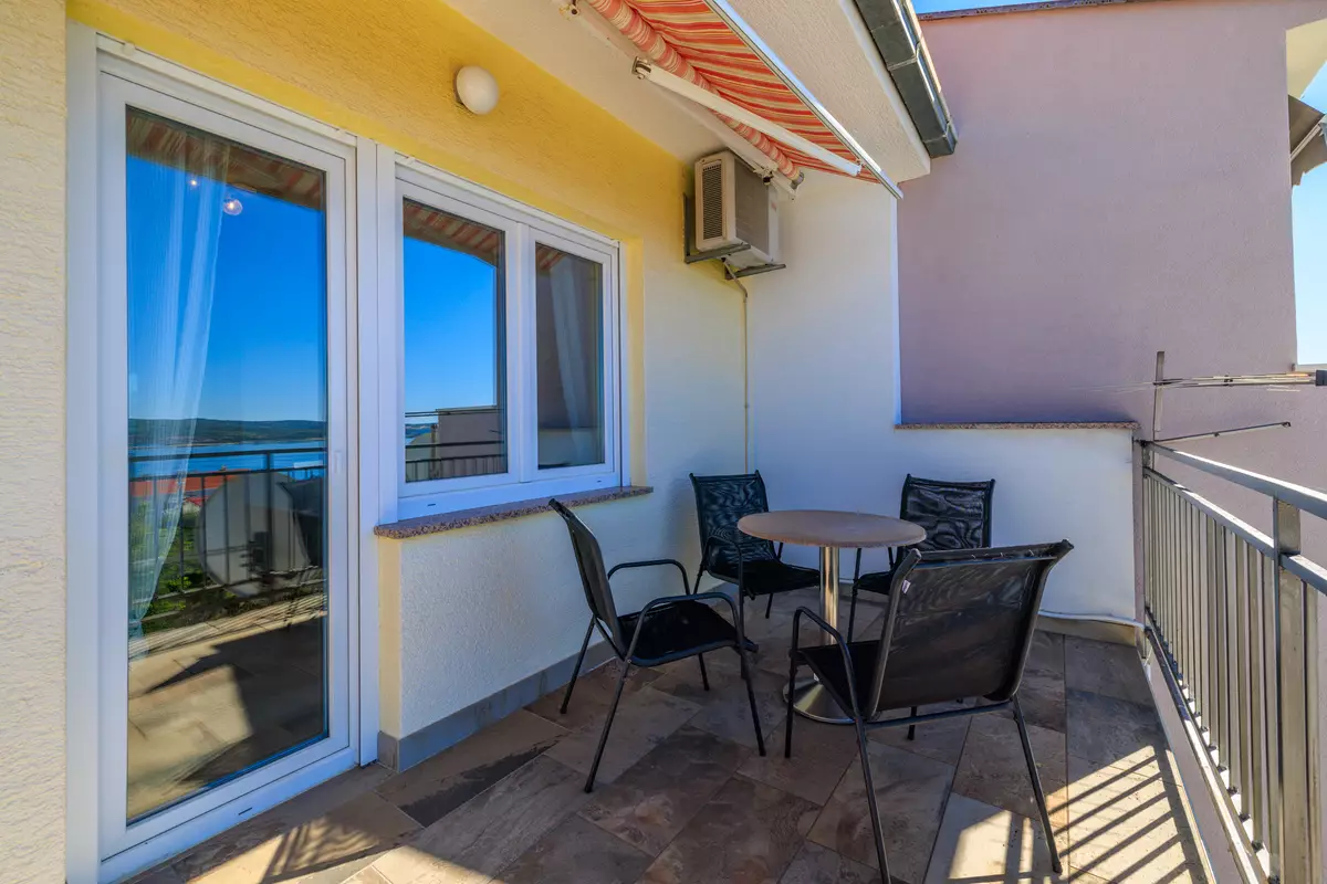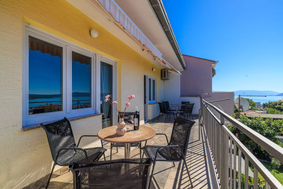 vlastiti balkon, djelomično natkriven s pogledom na more, garnitura za sjedenje, veličina balkona: 18 m², zajednička terasa s roštiljem je kat ispod