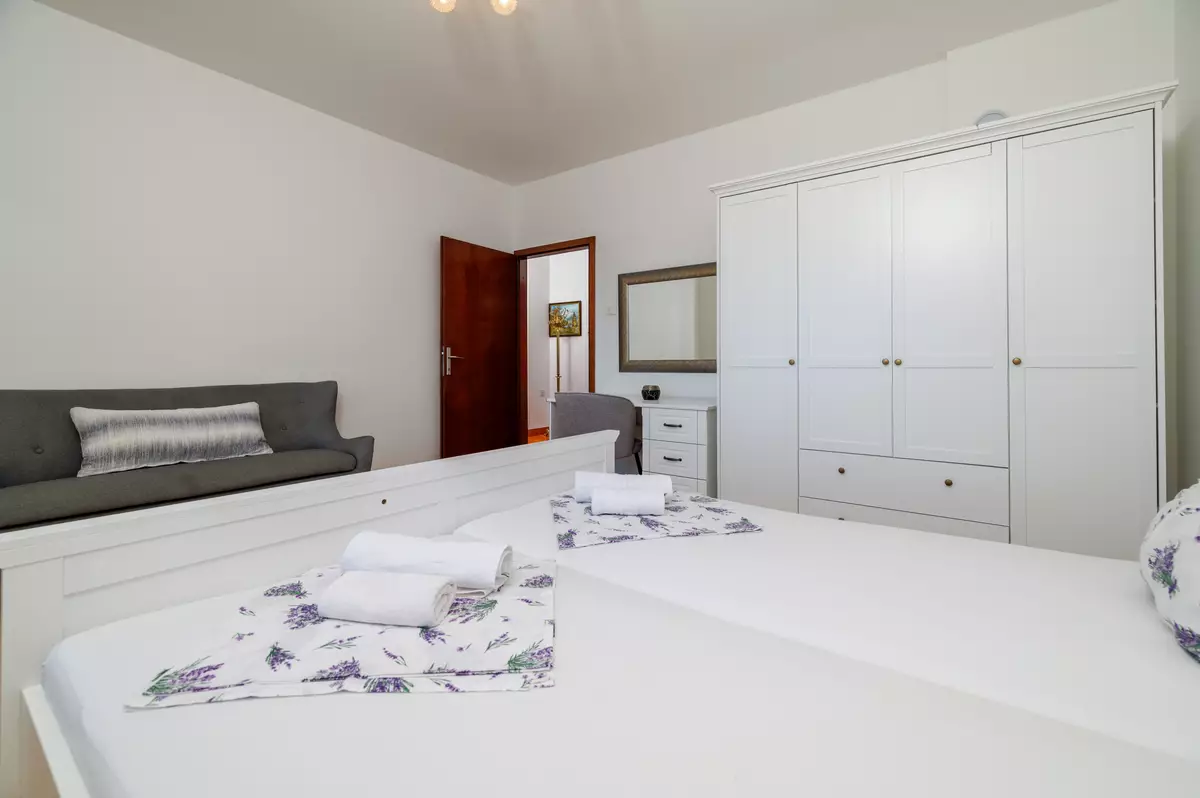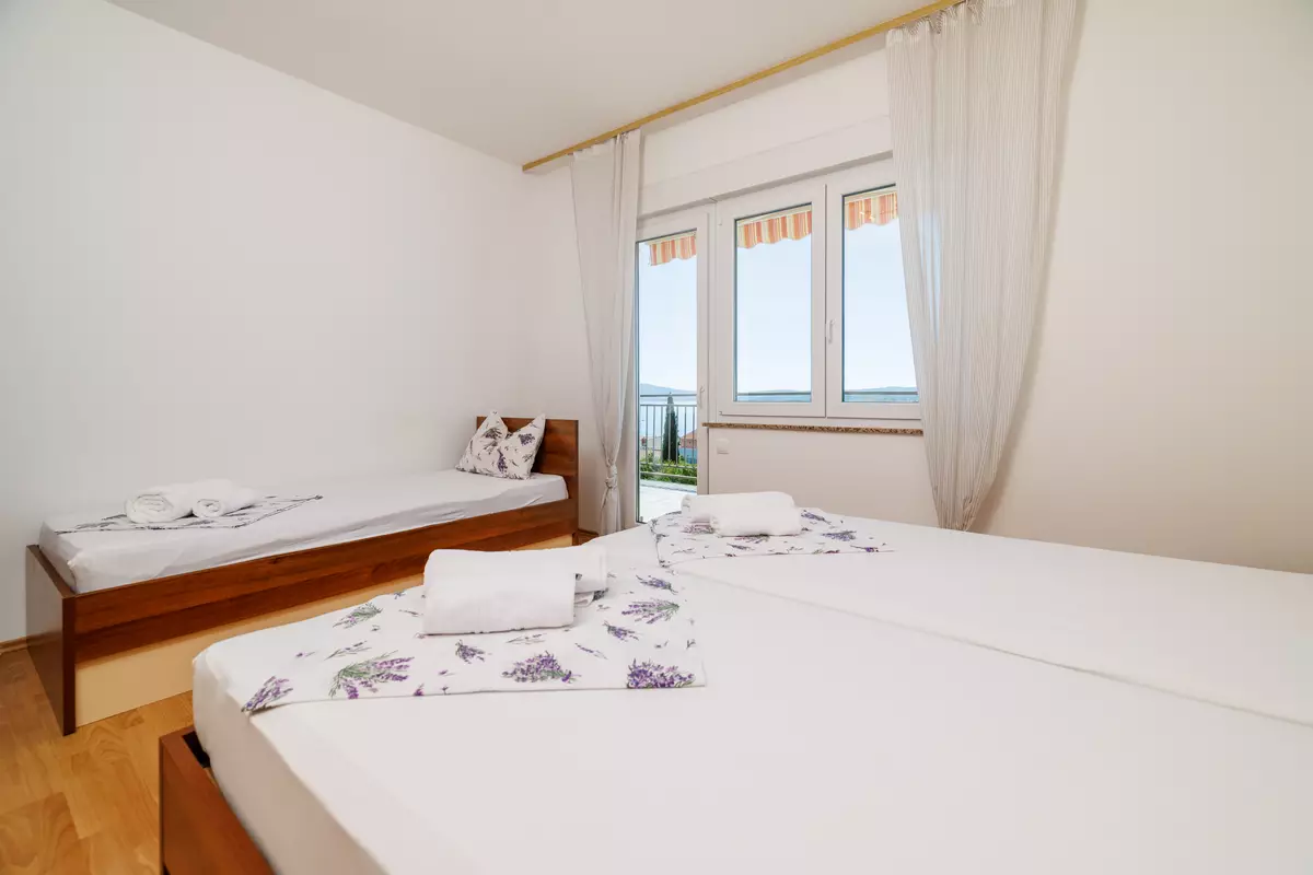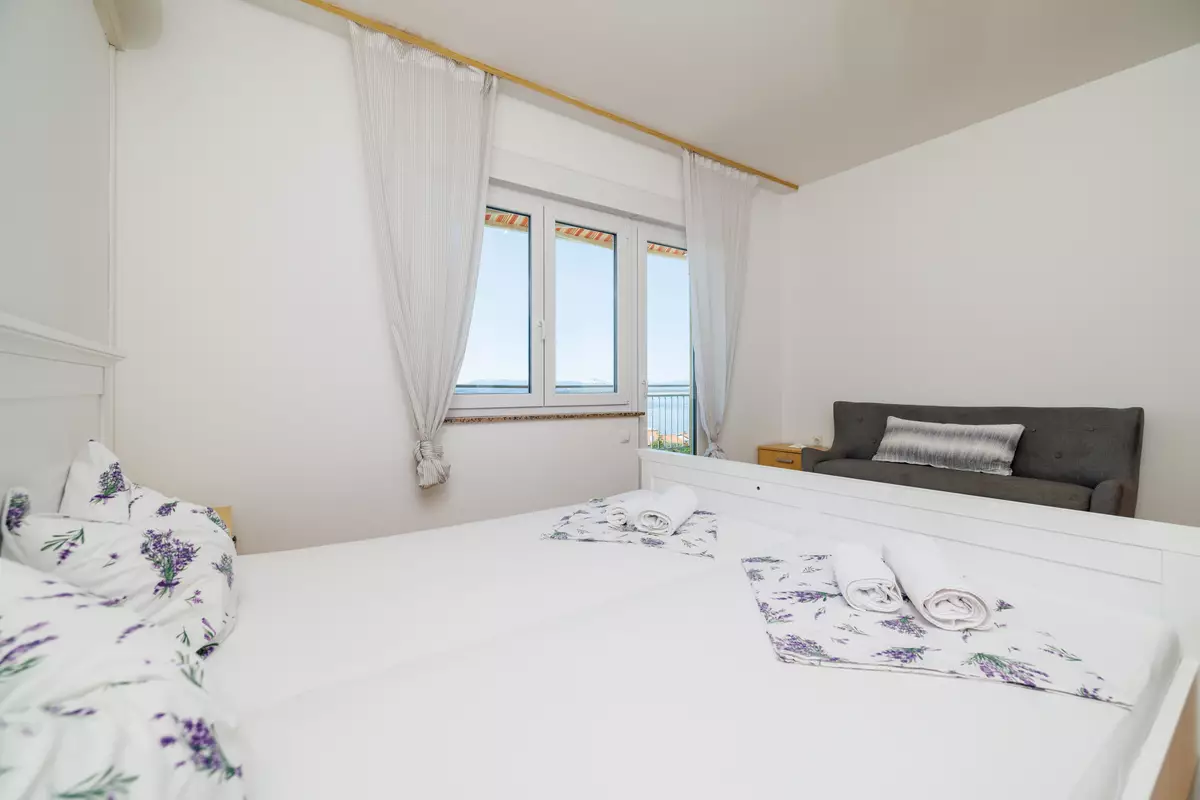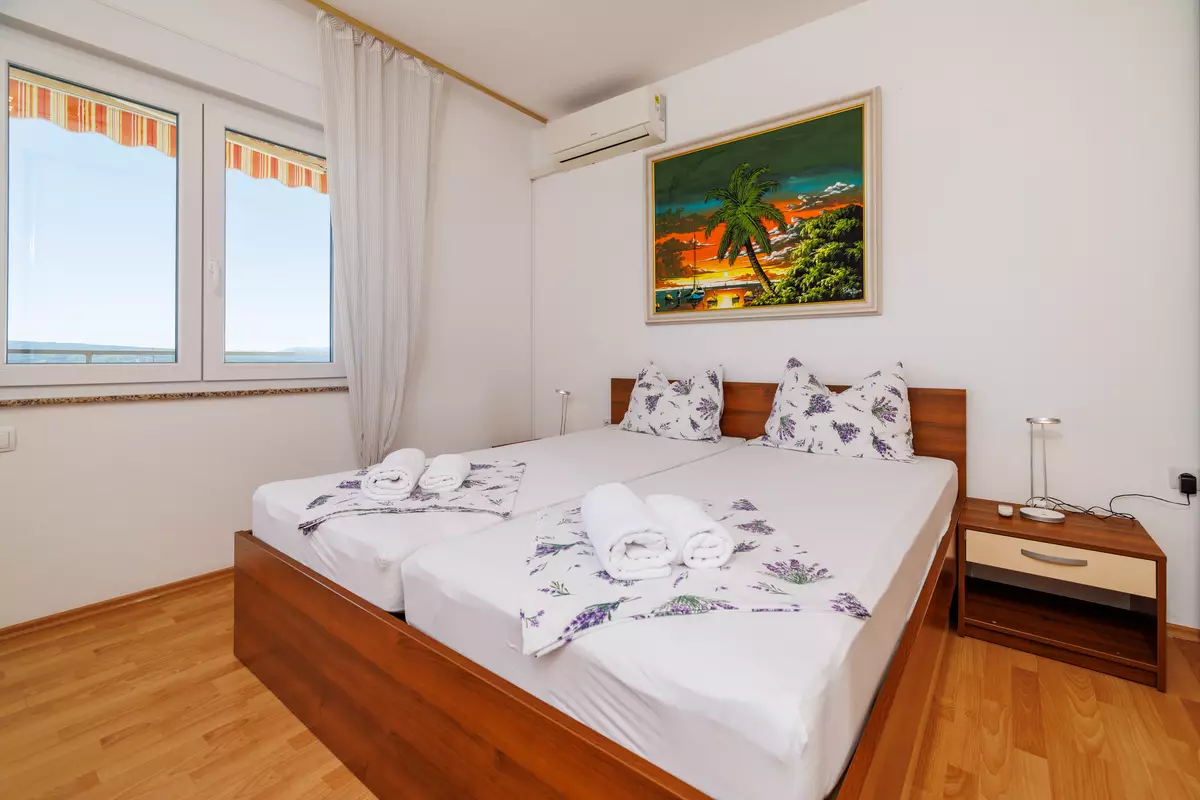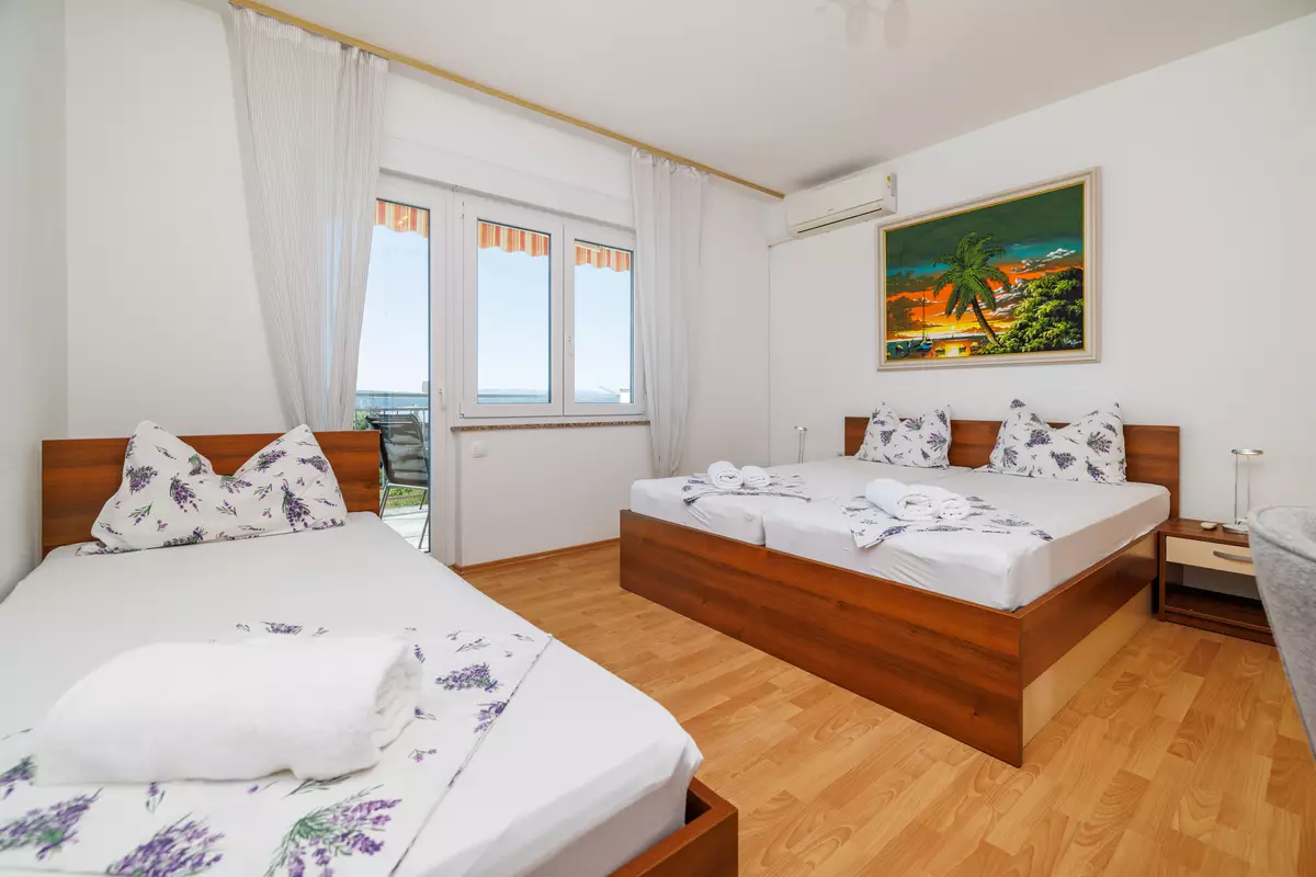 Dvokrevetna soba s bračnim krevetom, balkon, pogled na more, laminat