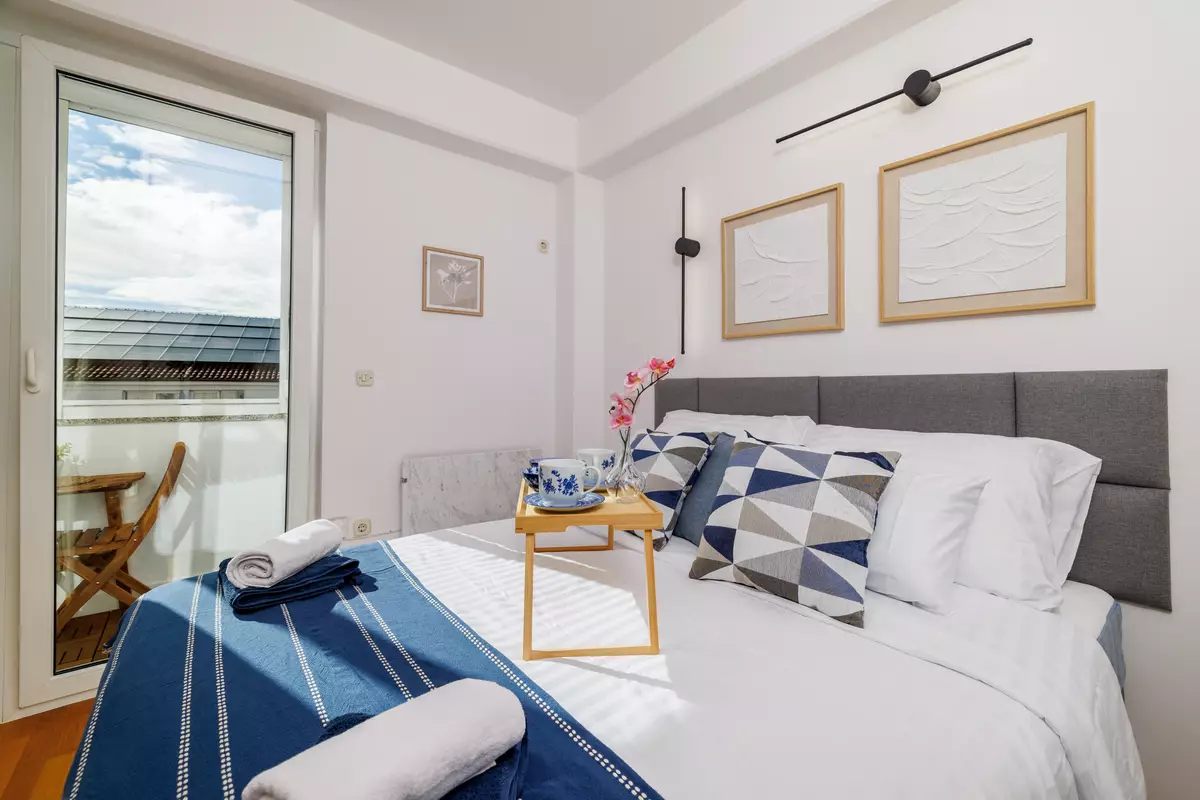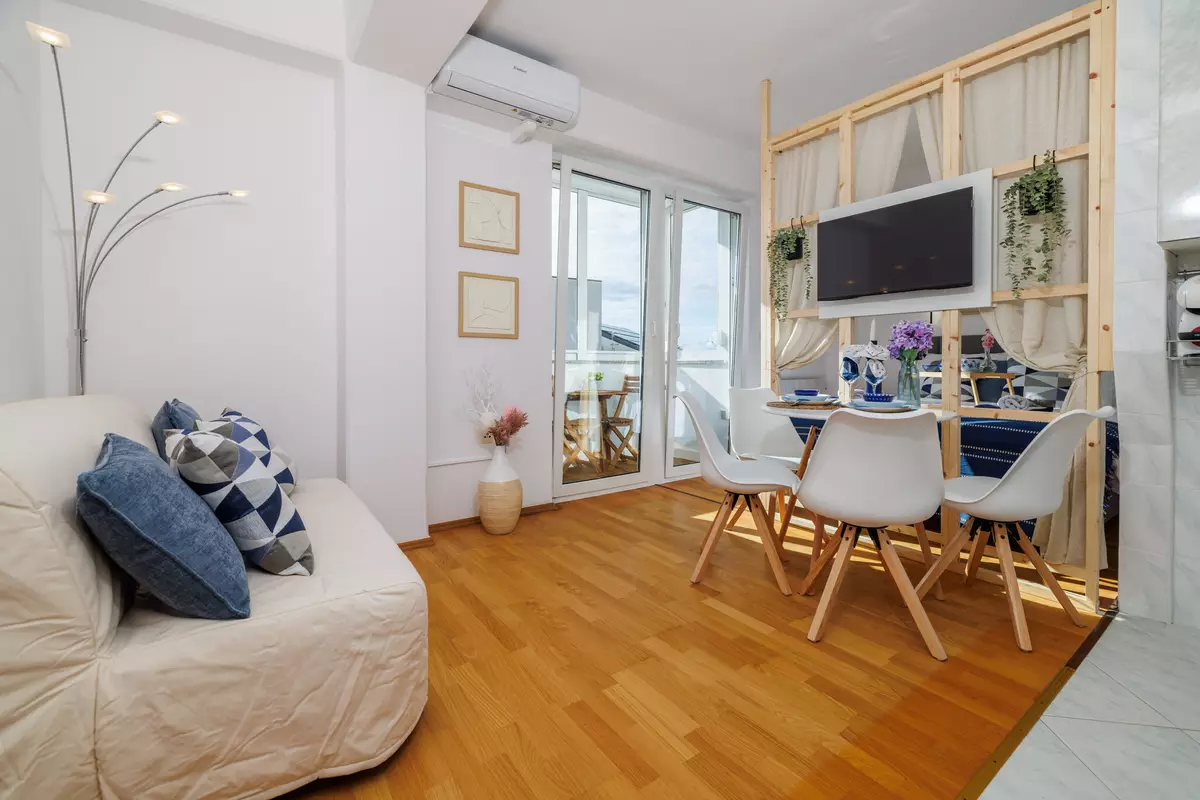 Vaš vlastiti natkriveni balkon (2 m²) poziva vas da započnete dan uz šalicu kave ili ga završite čašom vina, uvijek uz pogled na blistavo more.